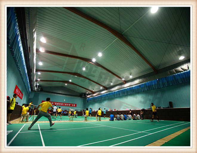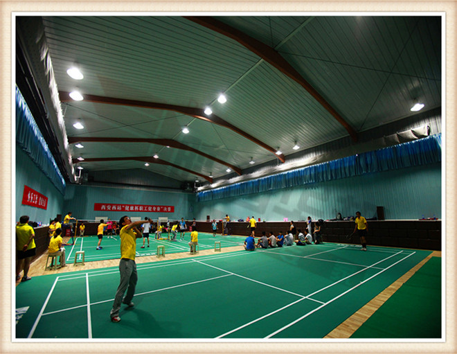 項目名稱:西安鐵運校羽毛球館 項目簡介:該項目含基礎處理、地面、墻面與屋頂裝飾裝修。墻面采用皮革軟包(1.5米以下)和吸音壁毯造型兩部分組成,屋頂裝飾鋁合金格柵,地面為運